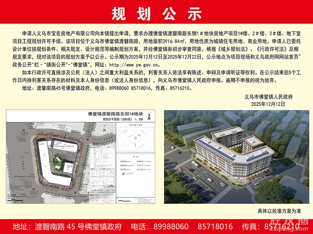 12月12日,佛堂鎮(zhèn)渡磬南路東側(cè)1#地塊規(guī)劃方案公示。 申請人義烏市寶宏房地產(chǎn)有限公司向本鎮(zhèn)提出申請,要求辦理佛堂鎮(zhèn)渡馨南路東側(cè)1#地塊房地產(chǎn)項目1#樓、2#樓、3#樓、地下室項目工程規(guī)劃許可手續(xù)。 申請人已委托設計單位按規(guī)劃條件、相關(guān)規(guī)定、設計規(guī)范等編制規(guī)劃方案,并經(jīng)佛堂鎮(zhèn)街初步審查同意。根據(jù)《城鄉(xiāng)規(guī)劃法》、《行政許可法》及相規(guī)定要求,現(xiàn)對該項目的規(guī)劃方案予以公示。 公示期為2025年12月12日至2025年12月22日,公示地點為項目現(xiàn)場和義烏政府網(wǎng)網(wǎng)站首頁政務公開“欄-“鎮(zhèn)街公開”-"佛堂鎮(zhèn)",網(wǎng)址:http://www.yw.gov.cn。